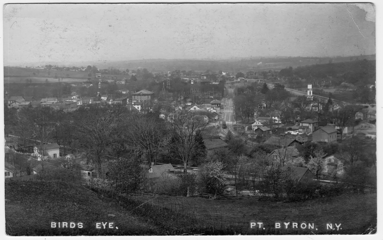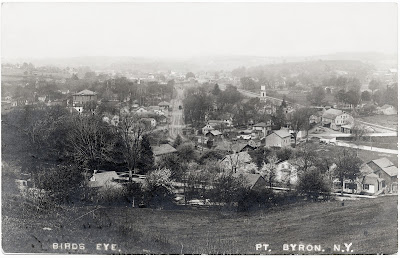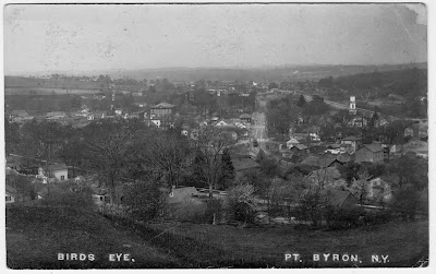 Bill Hecht sent along the early “birdseye” looking west along the Enlarged Erie. It should be called a “hillseye” as the photographer is standing on the hill to the east of the village, a favorite spot for many photographers. The newer birdseye, looks west along the new Rochester, Syracuse and Eastern Interurban line.