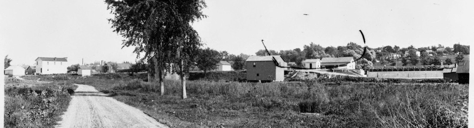 The top view looks east along the road to the Erie House, showing the hotel as it was first built. Behind the hotel, we can see the mule barn and the back half of the blacksmith shop. To the right of the hotel, we see the smallwhite ice house. Although you can’t see the canal, the dark building to the right of the ice house is part of Tanner’s Drydock, which was on the south bank of the canal.