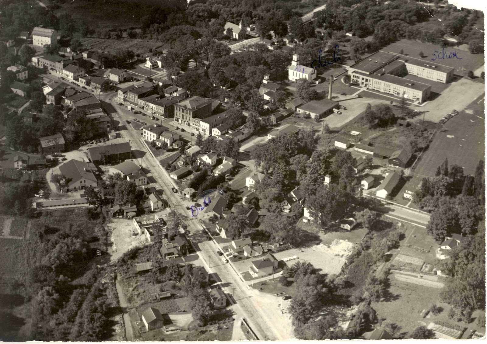 Before the invention of the airplane, someone wanting a “birdseye” view of the village had to climb to the top of a nearby hill and hope for an open view. We have posted some of these birdseye views in prior post. After planes became available, it was easier to get a real birdseye or aerial view. Here are some we have found.